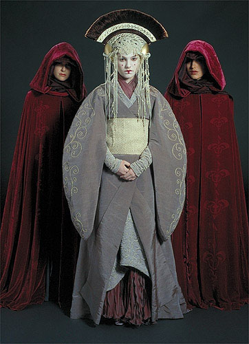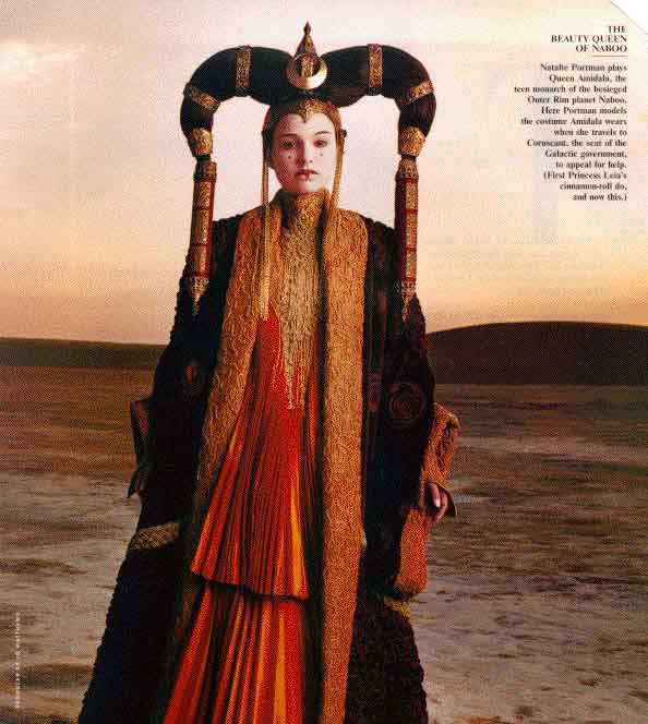 | Queen Amidala, played by Natalie Portman, is the queen of Naboo. Later in the trilogy we discover that she is the mother of Luke and Leia. In the Phantom Menace she falls under the protection of Obi-wan Kenobi and Jedi Master Qui-Gon Jinn after the gready Trade Federation invades her peaceful planet. When she is albe to escape the fortress they have set up around her she flys away with her handmaidens, the jedis and a few others. When they landed on the planet Tatooine she meets a young boy by the name of Anakin Skywalker. Who they wind up taking with them on their journy. After fixing their hyperdrive they contine on to Corusant to make there plee to the Imperial Senate. With no help from the senate, they go back to Naboo. While there Queen Amidala was able to unite the Gungans and persuade them to fight for Naboo. In the end she winds upbeing the hero. When needed in the movie she is able to disguise herself as Padme Naberrie. Now for some Quotes: "There are things I cannot do. I cannot watch my people suffer. I cannot sit when something must be done. I cannot judge those who are different. There are things I cannot do. Run. Hide. Ignore. There are things I cannot do. But there are things I certainly can do!" "I was not elected to watch my people suffer and die while you discuss this invasion in a comittie!" |